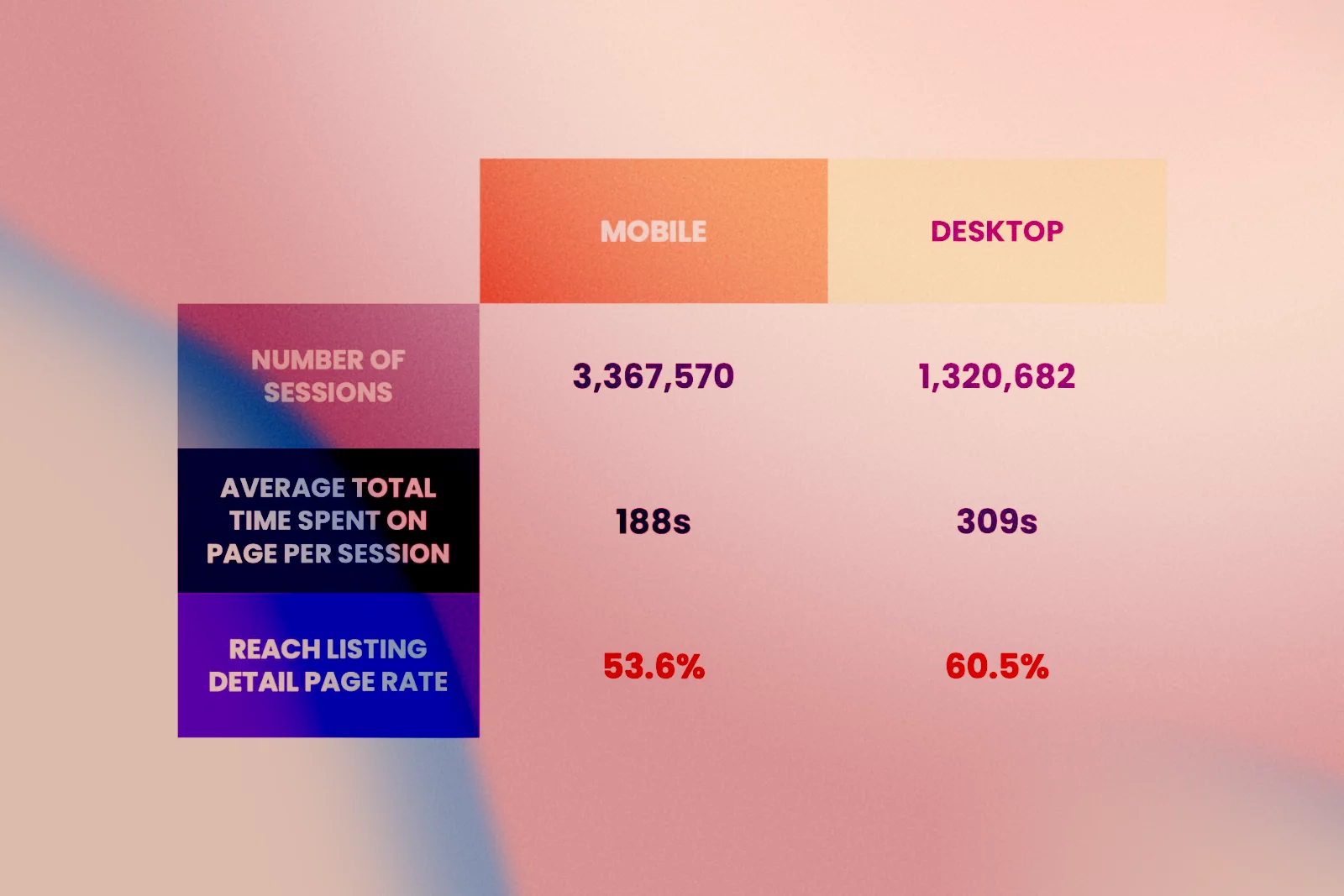 Despite this, 38% of users exited the SRP without visiting a listing detail page or contacting an agent, and of these, mobile accounted for 72% of listing page sessions but had a lower conversion rate than desktop.