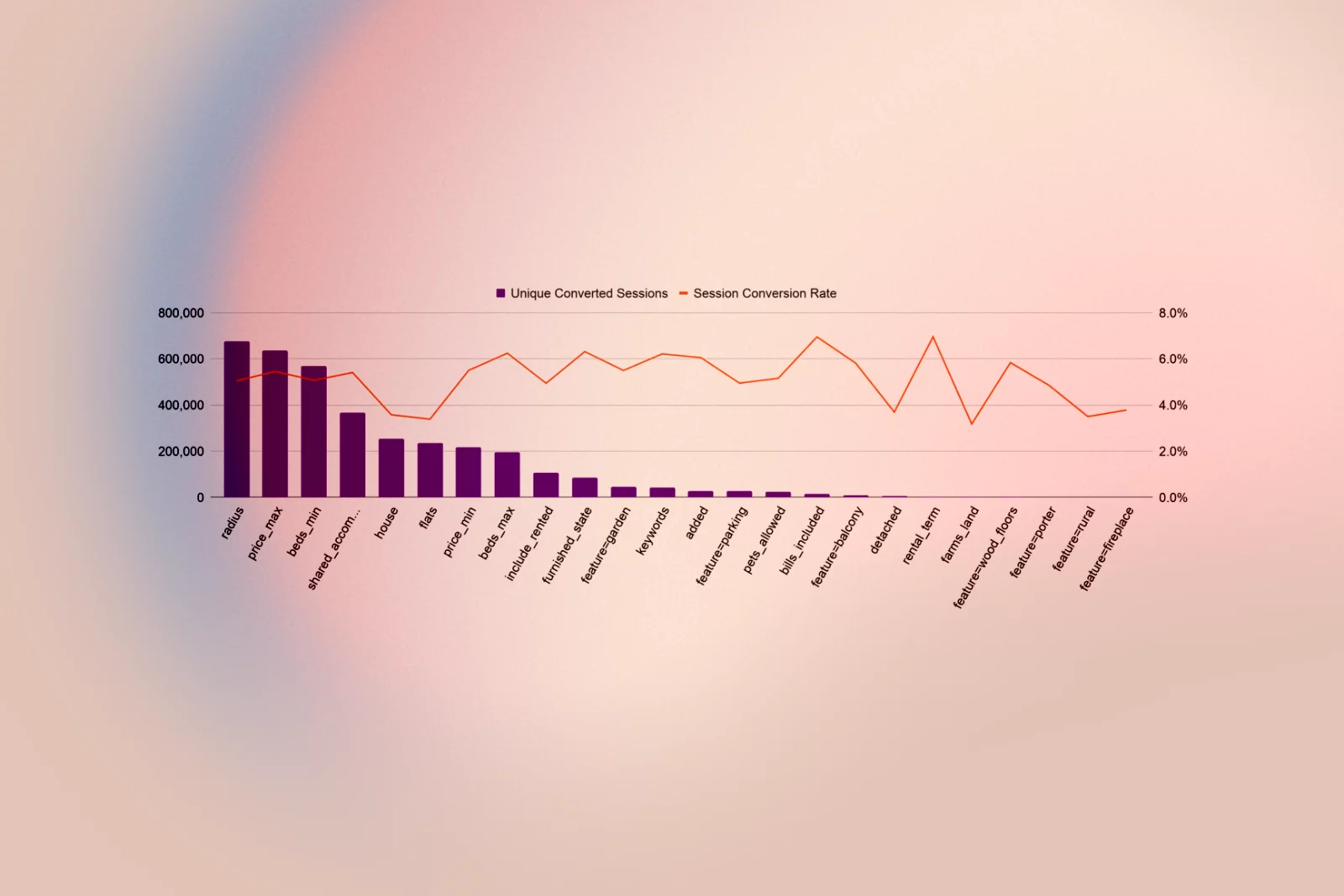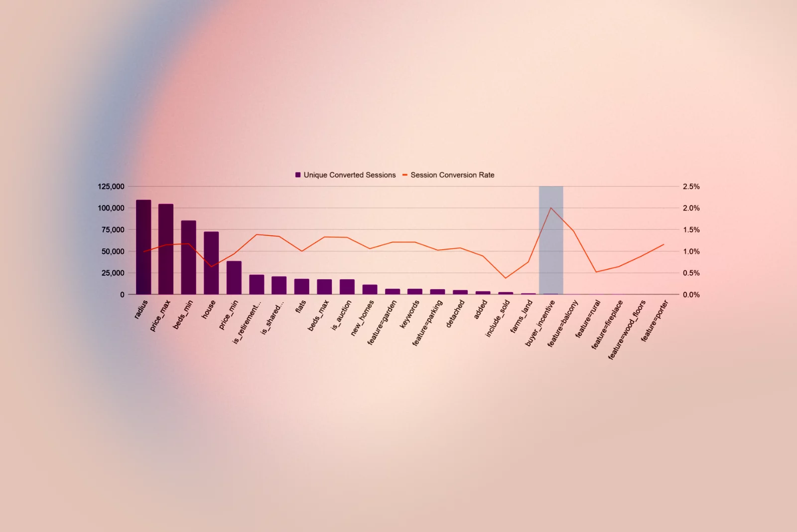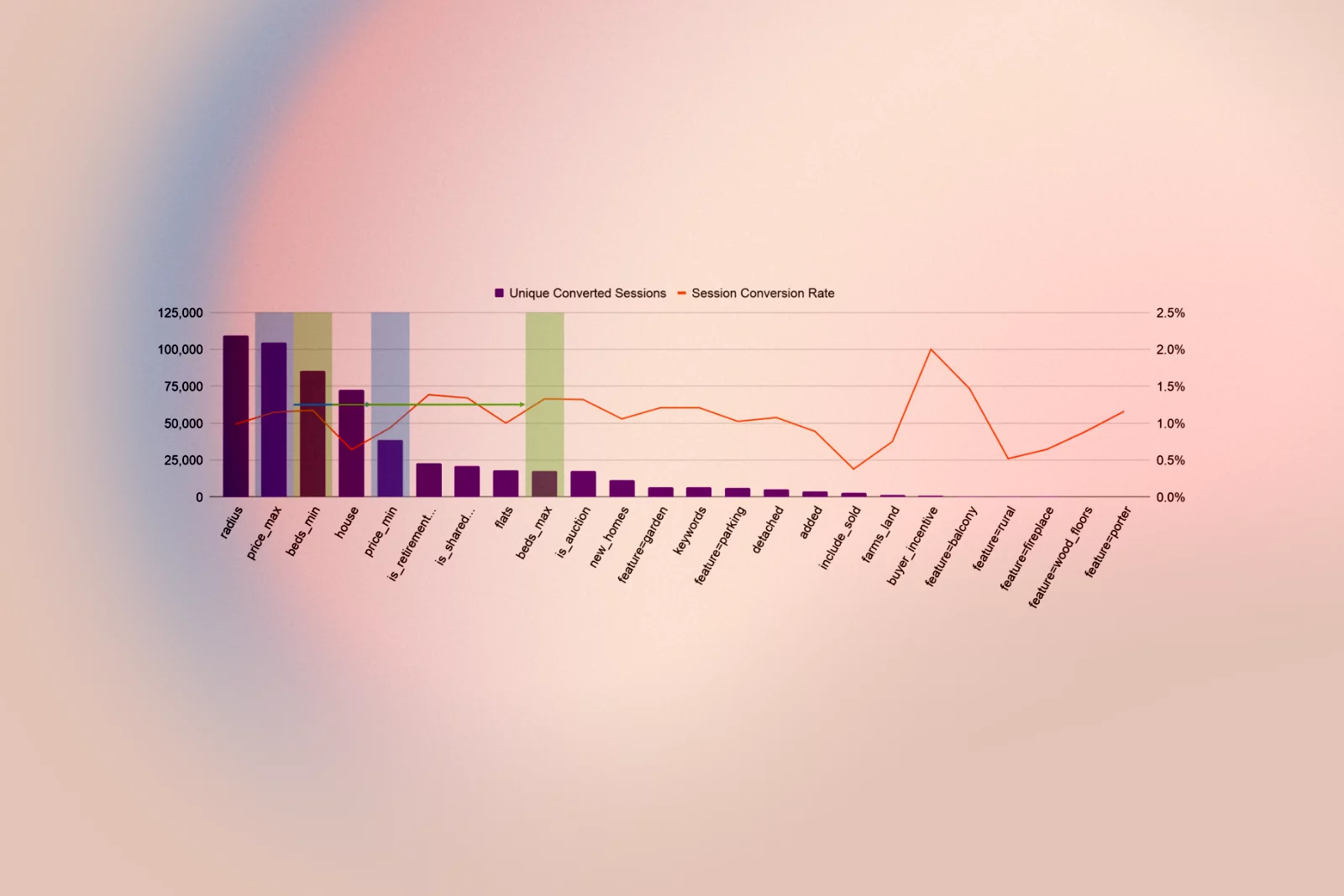 - For Sale: users are more likely to set a maximum price and minimum bedrooms than the opposite, and those only using a minimum price filter perform as poorly as users with no price filter, indicating “dream browsing”.