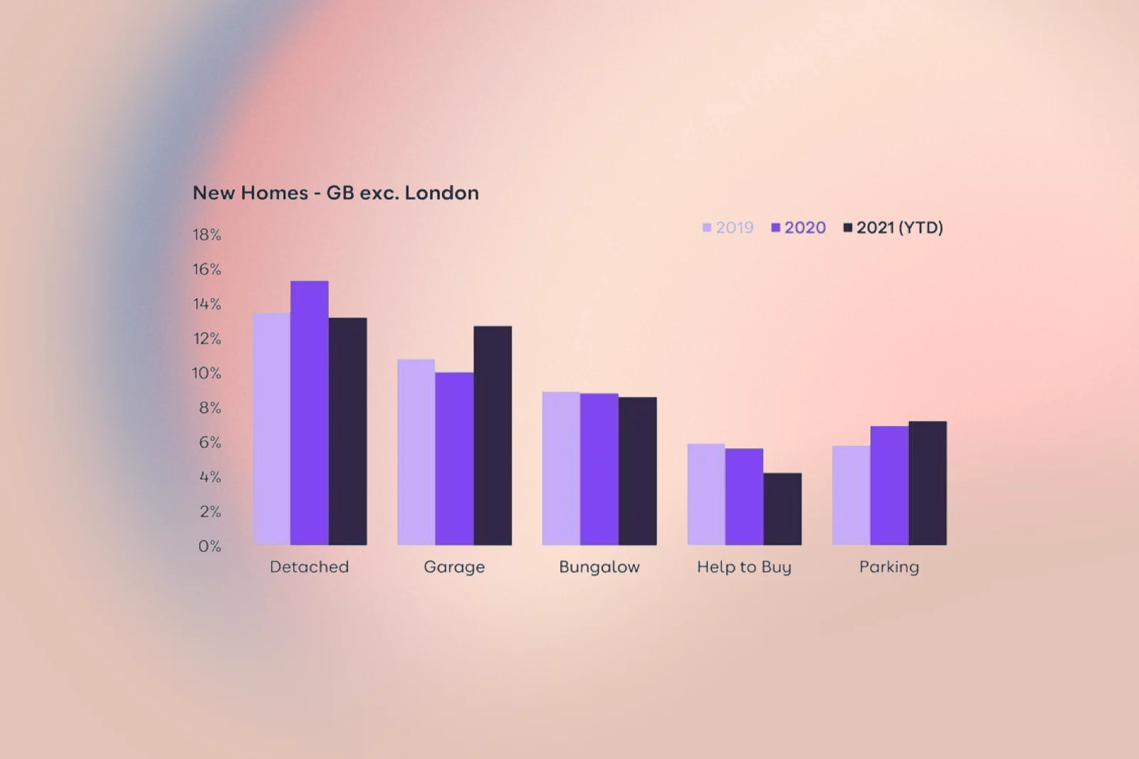 - Among new homes, detached houses are the most searched property type, and off-road parking is the most sought-after feature.