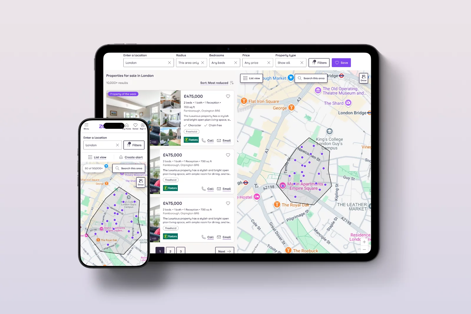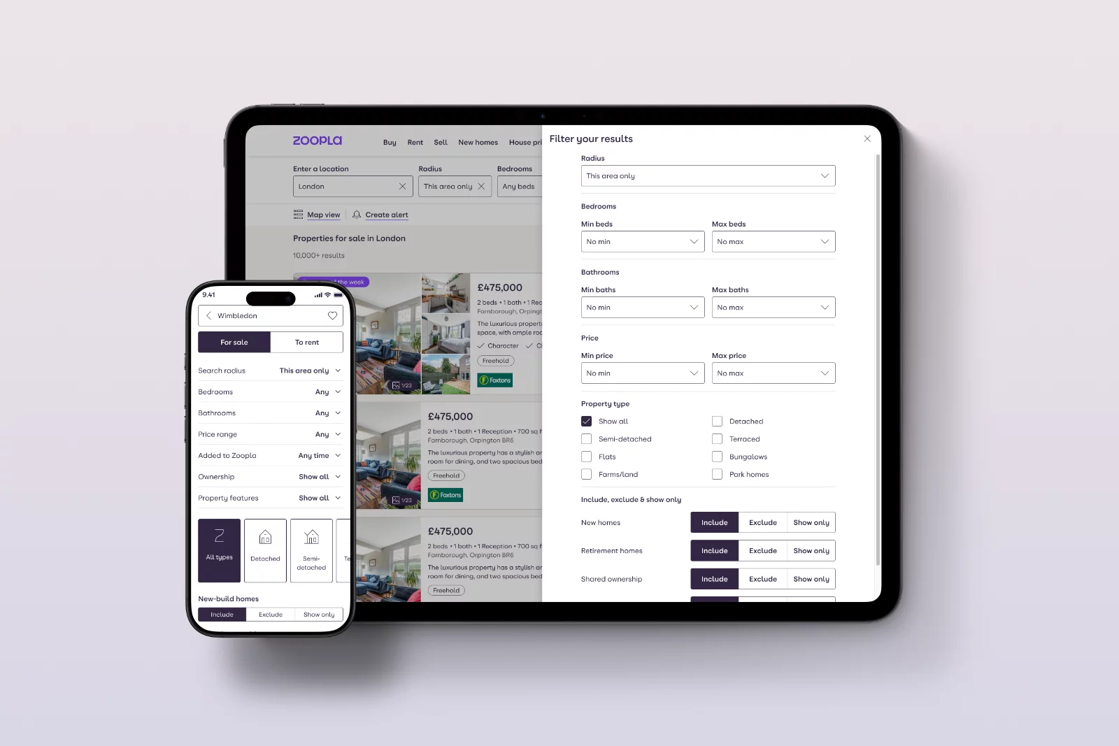 I used Zoopla’s existing design system as the foundation, extending it where necessary to support a more modern, mobile‑first search experience and to align web and app patterns. The design work focused on several key areas.