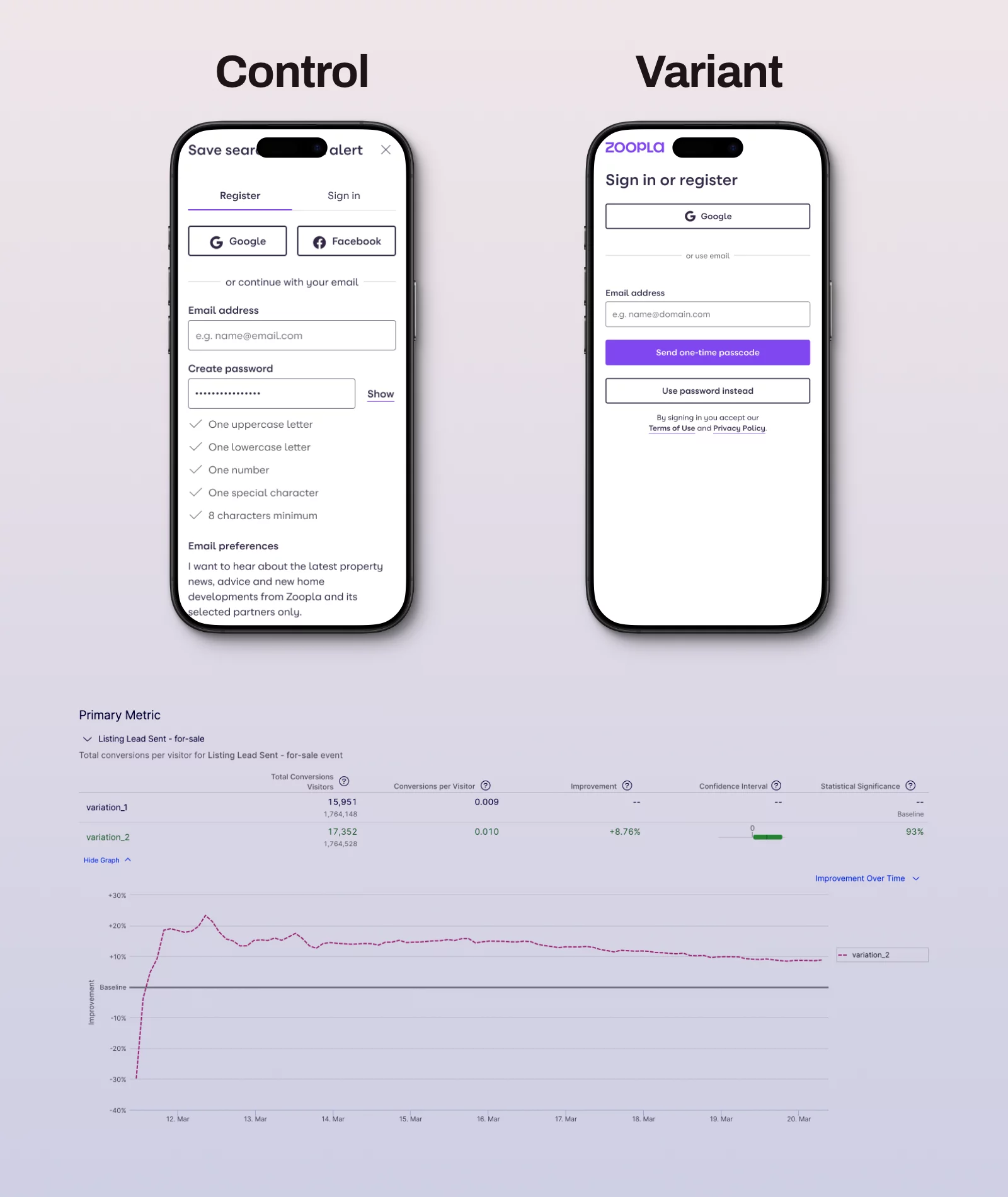 A shorter, unified, and passwordless save search sign-up form with a prominent CTA increased registration completion rates and boosted call and email lead conversions to 8.76 for Sale SRPs.